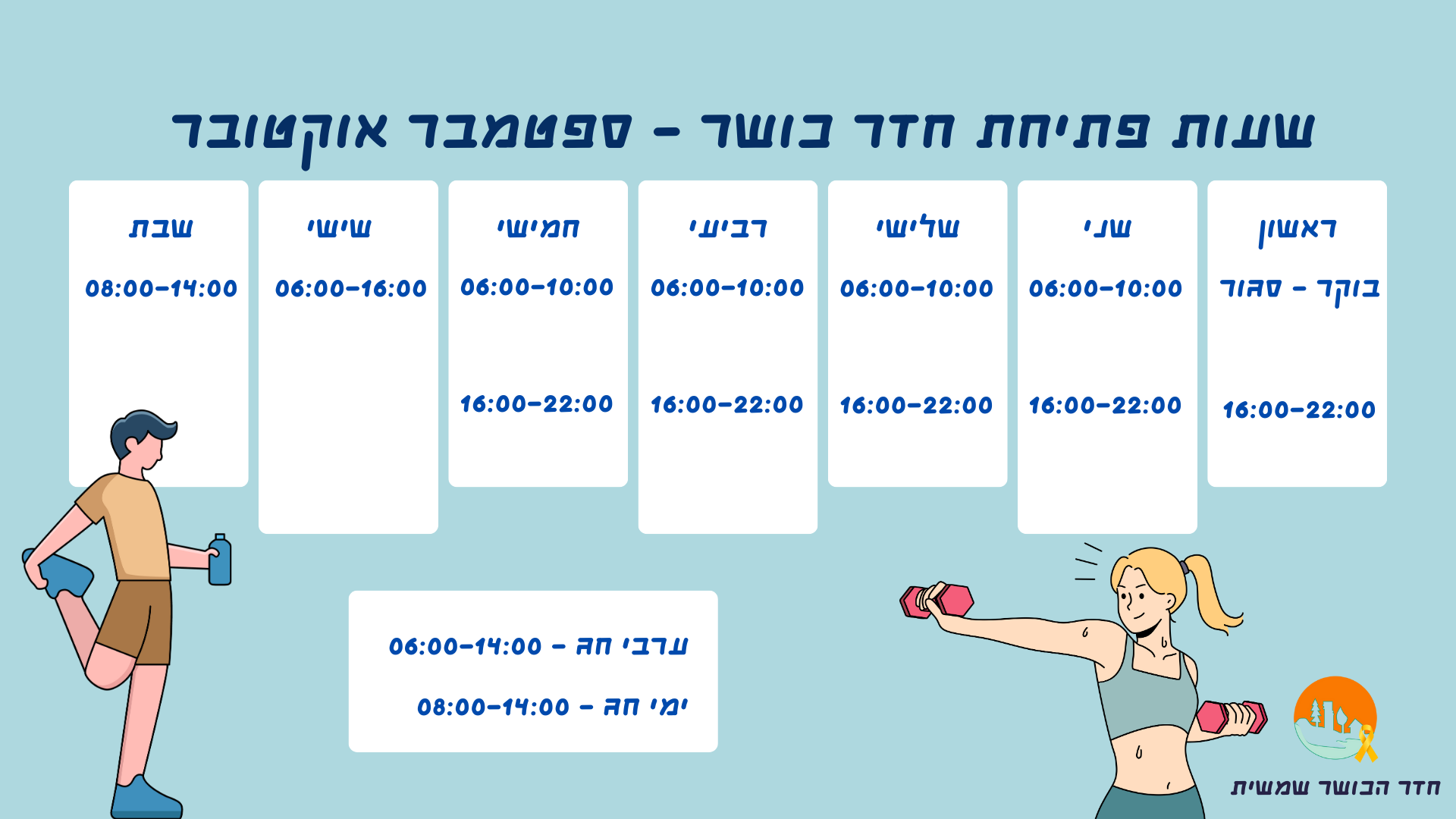 לשעות פתיחת חדר הכושר ספטמבר/אוקטובר 2025 לחצו כאן